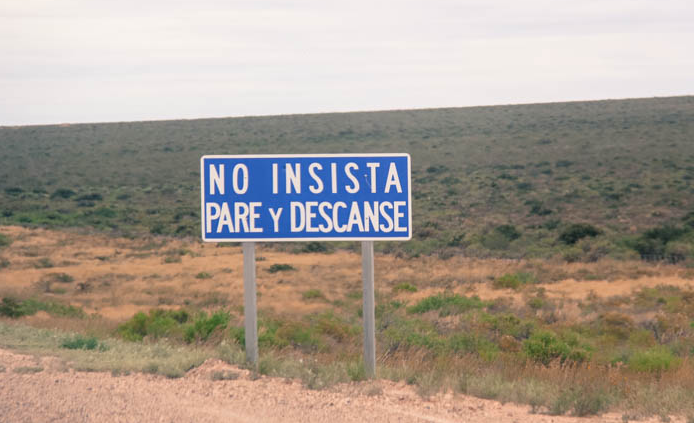 Provincial Route No. 20 runs for mile after mile across the plain, a looping landscape that can lull you into a low-grade sleep that turns deadly. It even goes by “Ruta del Desierto” (the Desert Route), where the only “distractions” —paradoxically, warnings— are car chassis mounted on columns, paired with signs that read things like “Fell asleep and rolled over” or “Pull over and rest!” Blasting “King of the Road” while you’re behind the wheel might actually save your life out there.