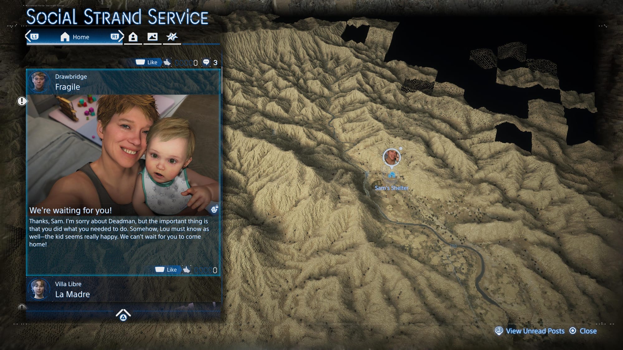 No quiero pecar de (tan) inocente. Que Kojima Productions haya restringido posibilidades de libre albedrío responde a una visión autoritaria, o como mínimo controladora, para el mundo de Death Stranding. Es una línea que presenta muchas aristas y merece su propio ensayo. En este artículo quiero enfocarme en otra de sus consecuencias: el vislumbrar lo potentes y reparadores que podemos ser como comunidad si tenemos las posibilidades y el incentivo.
