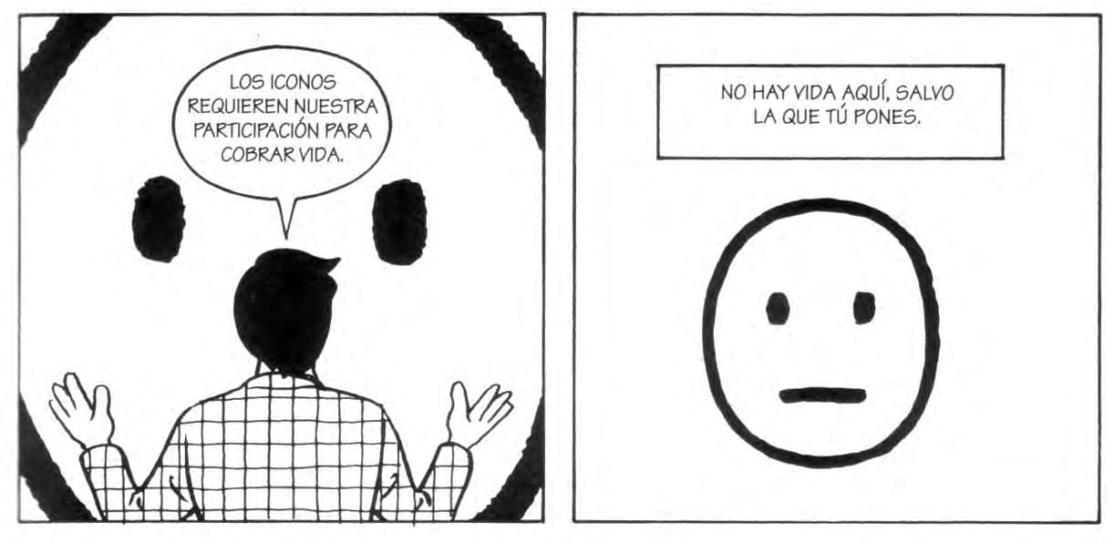 Gracias a su capacidad de encontrarse en todos lados, el ser humano también encuentra su rostro en las caricaturas. Los lectores pueden usar esos personajes caricaturescos y simples como una "máscara" para adentrarse en los mundos de las narrativas gráficas. Leer un cómic o manga es un contrato entre autor y lector que supone una entrega total de ambos en un ejercicio constante de interpretación de iconografía interconectada. Viñeta a viñeta, por una especie de magia interpretativa, nosotros le prestamos vida y emociones a un cómic porque tenemos que realizar un ejercicio de entrega sensorial a esa historia. Y gracias a ese proceso de enmascaramiento es que un personaje simple puede ser mejor escudo que otro, porque albergará a más personas en sus expresiones.