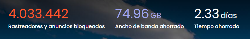 El propio Brave te muestra al abrir una nueva pestaña –si querés– una suerte de contadores. Desde el último formateo de mi PC, lleva bloqueados más de 4 millones de trackers, ads y pop-ups de todo tipo. Un ahorro de ancho de banda de casi 75 gigas, y de tiempo de navegación de más de 56 horas.