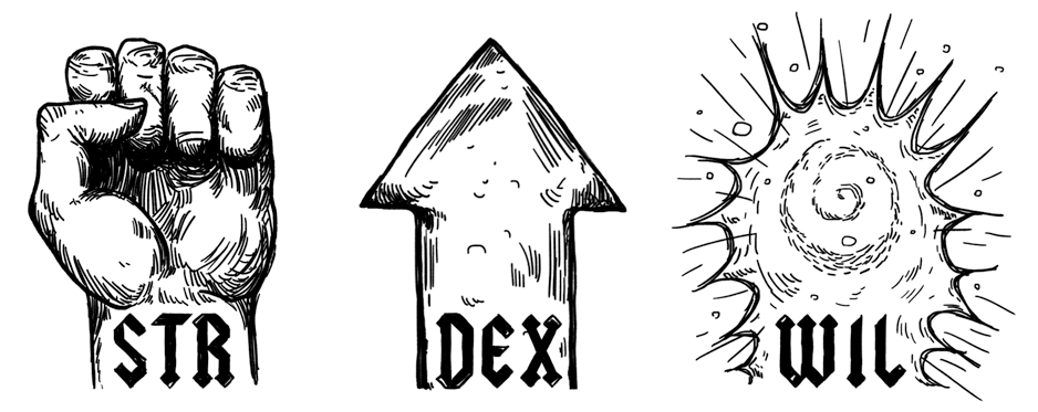 Sólo existen tres atributos: fuerza, agilidad y voluntad, este último el atributo de la magia y la inteligencia. Y como Dungeon Master, sos vos quien decide cuándo un jugador debe hacer una tirada. ¿Quiere romper una puerta? A tirar un d20 de fuerza. ¿Quiere pasar con sigilo? A tirar un d20 de agilidad. ¿Quiere convencer a alguien de una mentira? A tirar un d20 de voluntad. Y si el dado es igual o menor al número de su atributo (por ejemplo, si tiene 12 de fuerza y el dado saca un 8), entonces lo pasa. Pero si es mayor… entonces te toca inventar el problema en el que se acaba de meter solito. Eso es lo divertido de este sistema: vos, como Dungeon Master, elegís cómo afrontar cada situación.