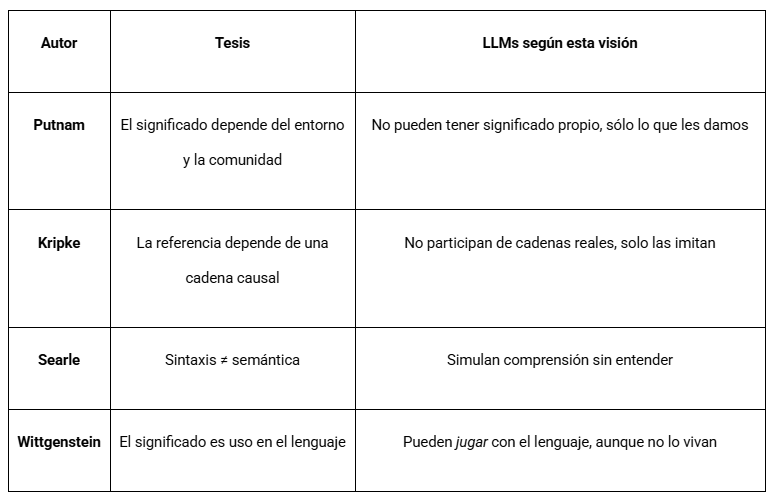 La pregunta de cómo los modelos de lenguaje (LLM) pueden generar lenguaje con sentido sin "saber" lo que están haciendo dialoga directamente con el externalismo semántico de Putnam y los aportes de Kripke.