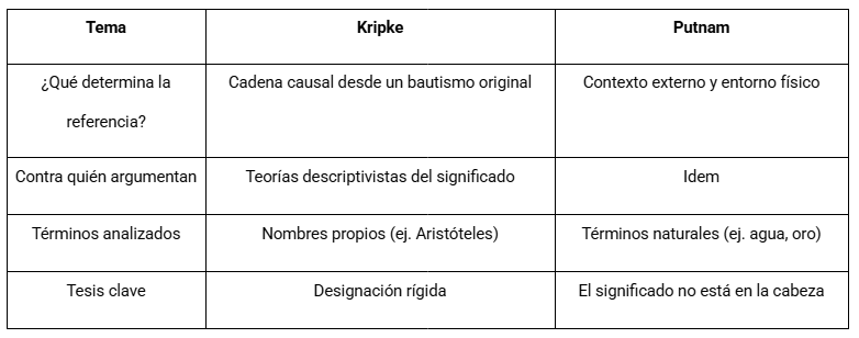 La conexión entre Putnam y Saul Kripke es fundamental para entender el giro externalista en la filosofía del lenguaje de los '70. En Naming and Necessity (1972), Kripke critica la teoría descriptivista del significado (Frege/Russell), proponiendo que: