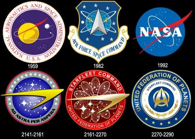 En una de estas tablas, los primeros tres logos pertenecen las agencias espaciales oficiales de Estados Unidos (el del medio, el de la Fuerza Espacial de 1982) y el resto a la franquicia de Star Trek, con las fechas correspondientes a su lore: