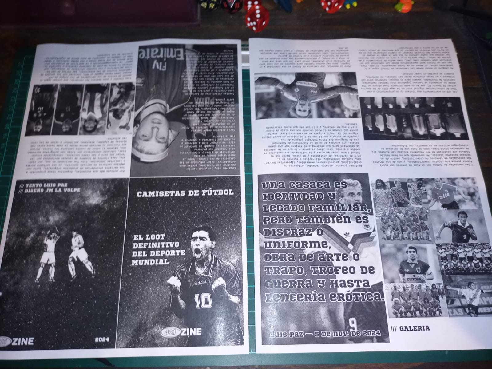 Supongamos que hacemos el primer número de este 421ZINE con la nota del compañero Lucho, Camisetas de fútbol, el loot definitivo del deporte mundial. Acá el contenido ya lo tenemos trabajado, es un texto que habla sobre la identidad que se encuentra en las camisetas de fútbol y cómo se volvieron un objeto fetiche por diferentes razones.
