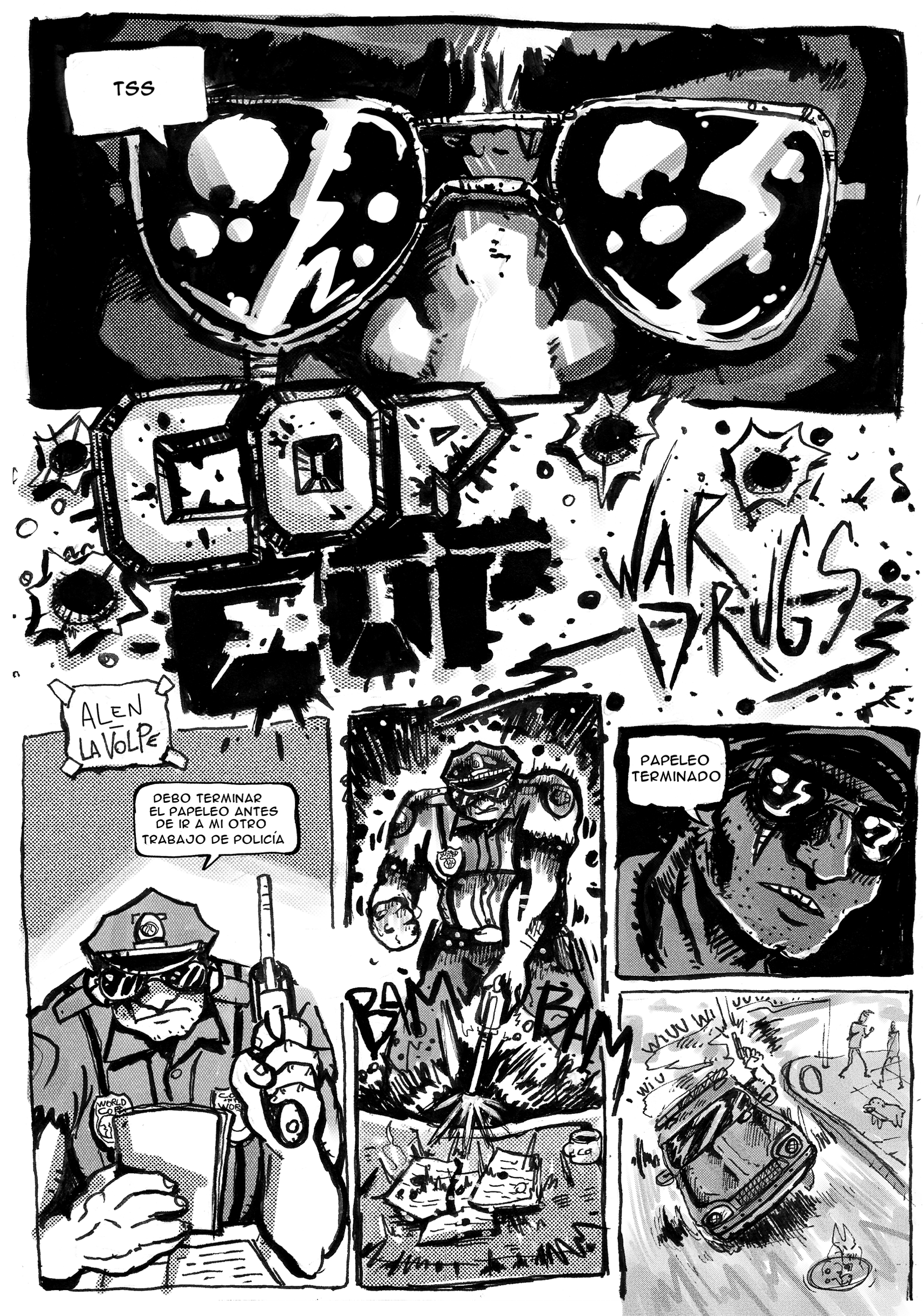 COPCOP es un cómic de absurda brutalidad policial y humor, guionado por Juanma La Volpe y dibujado por Alen Bruno. Fue publicado en 2018 y ganó el premio a Mejor Fanzine Falopa 2019, entregado por el jurado del evento Dibujadxs.