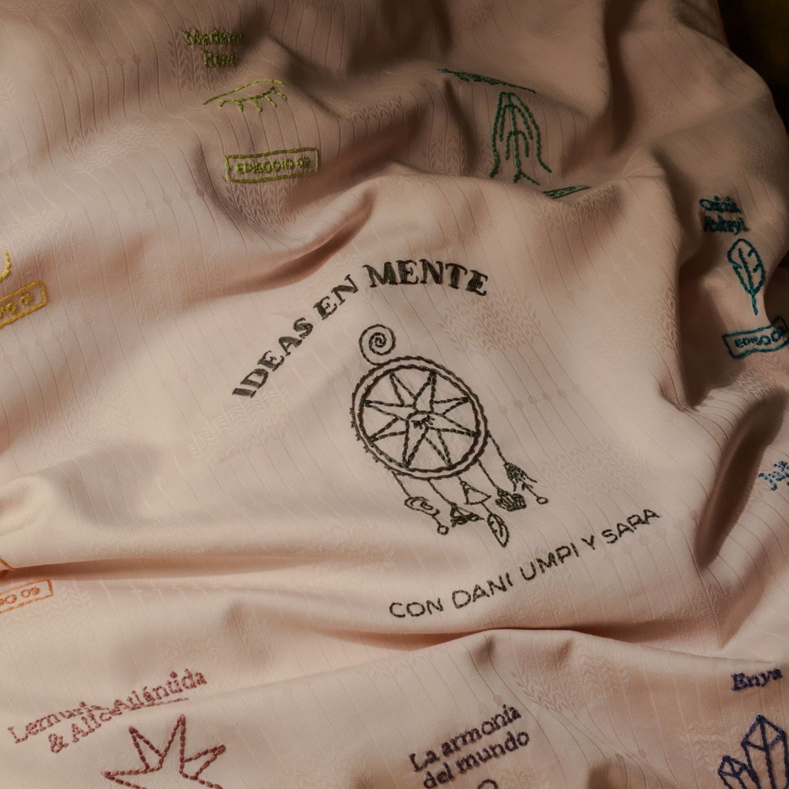 Ah, y también un último datito de color: para cada uno de los episodios, Santo Cielo diseñó y cosió un bordado a mano, con el título del capítulo y un símbolo distintivo. Manitos orantes, gemas, plumita, oreja, caparazón de caracol, estrella titilante, compás masón, un atrapasueños. Además, la tela sobre la que hizo los bordados corresponde a una funda de almohada que compró en una feria de segunda mano. Sí, la lavó antes de usarla como canvas. Un primor amanuense escrito en hilo y tela.