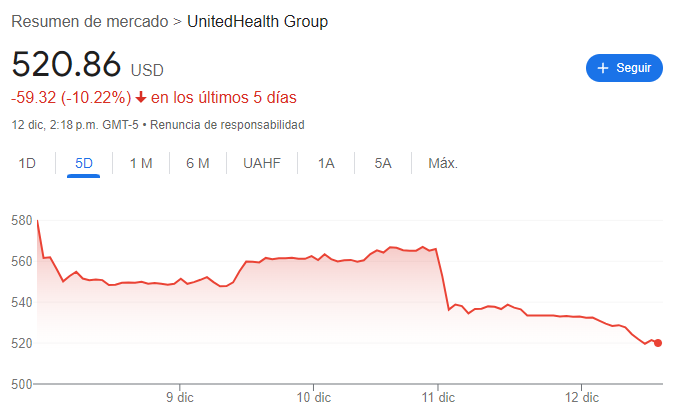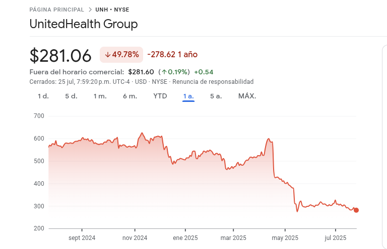 Mientras tanto, la acción de UnitedHealth Group siguió cayendo cerca de un 50% y en términos de capitalización total de mercado, la pérdida estimada es de aproximadamente 214 mil millones de dólares, pasando de 469 mil millones a 255 mil millones.
