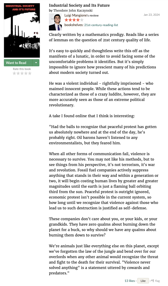 Pero hubo un dato que abrió el juego aún más a la especulación. Mangione tenía una cuenta de Goodreads en la cual iba rankeando y comentando lo que leía. Ahí se encontró una review del manifiesto del Unabomber, y acá internet se volvió completamente loco (yo incluído). Lo que había empezado como un ataque difícil de catalogar, empezaba a tener vínculos con la extensa tradición de terror doméstico de Estados Unidos, a la vez que corría el eje del sospechoso de ese lugar de supuesto "izquierdista".