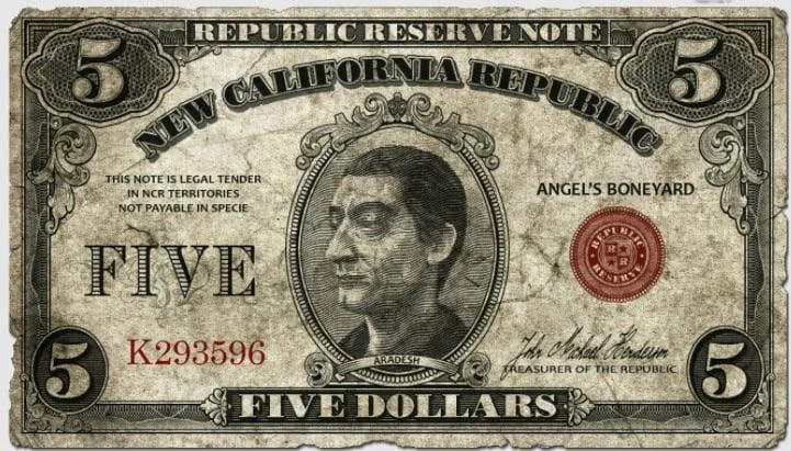 La NCR fue la primera forma de organización a gran escala, años después de las bombas, y con el tiempo estableció su medio de pago, el dólar de la NCR, backeado por oro. Sus billetes tuvieron amplia aceptación hasta los enfrentamientos contra la Hermandad, que logró destruir las reservas de oro. Los dólares de la RNC perdieron notablemente su valor.