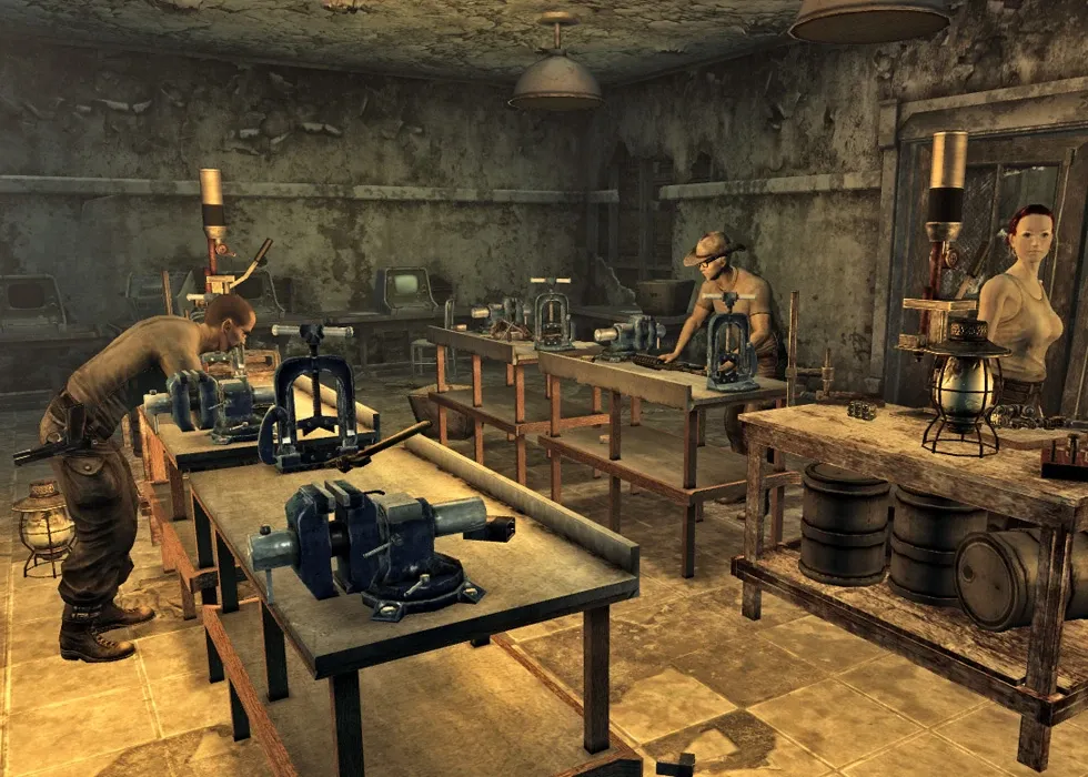 Los Gun Runners de F:NV, por ejemplo, son una de las organizaciones comerciales más poderosas de la saga y también una de las bocas de compra premium para PJs avanzados con capacidad de modificar armas a niveles top. El hecho de poder crear y customizar armas le agrega una de las pocas capas de producción que tiene este entramado económico, que básicamente se reduce a producir alimento o agua y a fabricar armas o drogas.