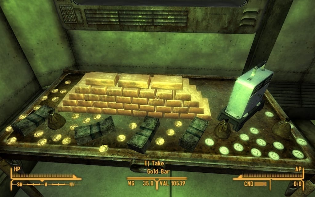 De hecho, aparecen otras monedas en la saga, como los denarios de plata y los áureos de oro de la Legión de César. Algunas comunidades menores también generaron sus propias divisas, así como los casinos tienen las fichas y también muchas empresas entregaban vales. ¿Bonos del Tesoro del gobierno? También hay. Y lingotes de oro, uno de los objetos que más me gusta acopiar para el late game en mis aguantaderos (especialmente si visito el casino Sierra Madre en Dead Money, uno de los DLC de F:NV).