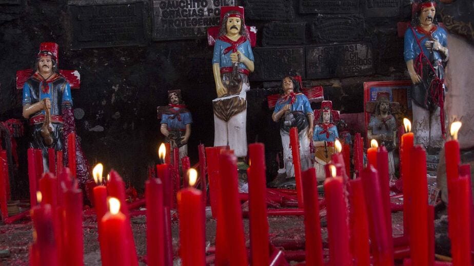 Su relación con el catolicismo se inscribe en esta misma lógica de fricción. La institución no lo reconoce, pero existe. Lleva la cruz y se le reza como intermediario ante Dios. A pesar de ser definido como un santo pagano, los curas de las zonas aledañas al santuario le abren las puertas a los devotos y milagreros, bendicen las imágenes, besan las estatuillas y dan misa en su nombre.