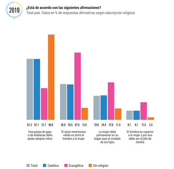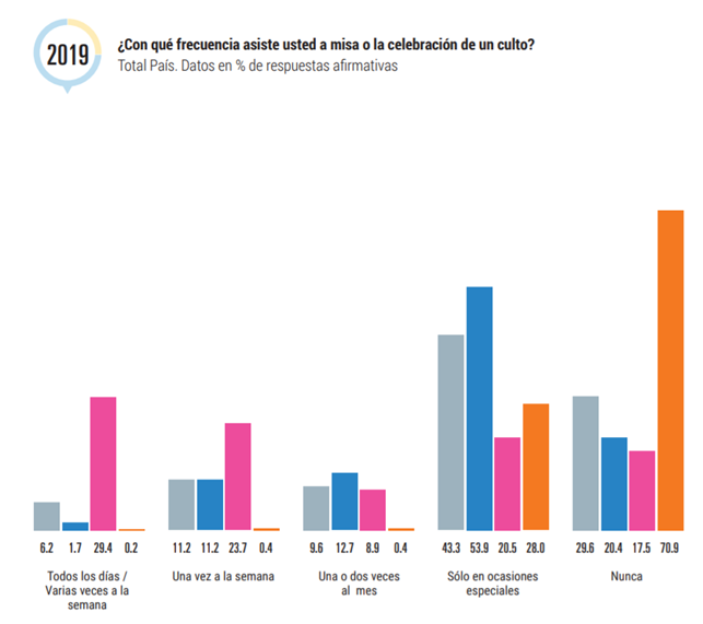 A diferencia de su par católico, la iglesia evangélica ejerce una influencia sobre sus miembros de forma mucho más directa, tal es así que puede caracterizarse cómo una minoría activa. Pasó del 9.0% en 2008 al 15.3% de la población en 2019. Este aumento significativo responde, sin duda, a la naturaleza militante del evangélico promedio. Para las iglesias evangélicas la pertenencia exige compromiso. Esto se ve en los números donde podemos ver que el 53% de los evangélicos consultados dijo ir al menos una vez por semana al templo contra un 12% católico. Si hacemos todos los cálculos necesarios, sobre una población de 40.000.000 millones de personas el número total sobre cuántos evangélicos y católicos van al menos una vez por semana al templo, da lo mismo, un número cercano a 3 millones. Pero con la diferencia de que el 60% del país dice ser católico y tan sólo un 15% dice ser evangélico. A esto me refiero cuando digo que es una “minoría activa”.