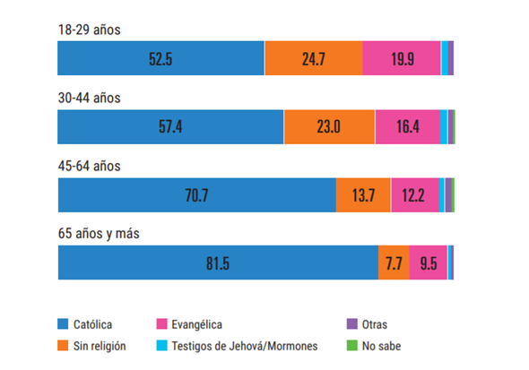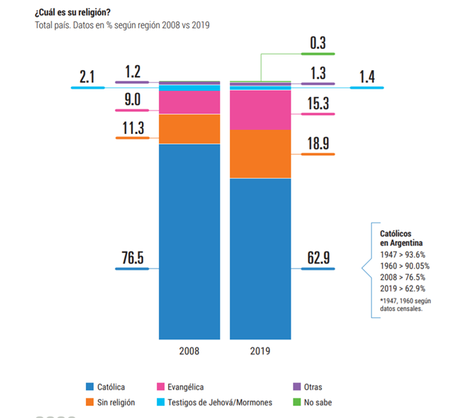 Si bien hoy el catolicismo retiene influencia porque ocupa lugares institucionales, la realidad es que su base militante está muy disminuida, al menos en nuestro país. Incluso tiene severos problemas para entrenar nuevos sacerdotes. Obvio que esto tiene que ver con un proceso de secularización constante que vamos atravesando en varias partes del mundo, donde la iglesia fue perdiendo su capacidad de ser la principal estructura de educación. Dato que podemos corroborar cuando vemos el desglose etario de las creencias religiosas. Mientras que los mayores de 65 sólo un 7.7% dice ser ateo, ese número se triplica cuando nos vamos a la franja etaria de los 18–44 años.