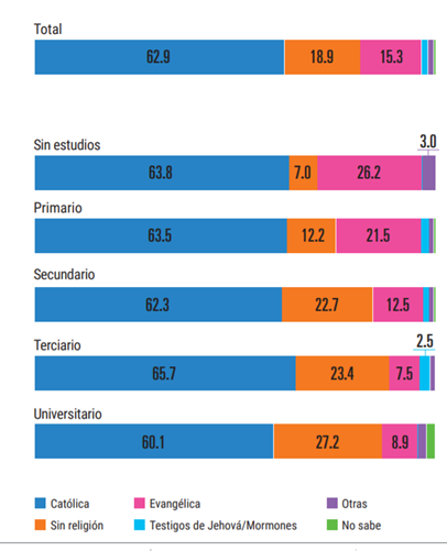 La lectura minuciosa de la encuesta sobre religiones también muestra no sólo el crecimiento de los evangélicos, sino por el mismo crecimiento en los “sin religión”, que creció siete puntos en once años, incluso superando el crecimiento del cuco evangélico. Esto nos habla de dos cosas: por un lado la caída sostenida del catolicismo como estándar de creencias en la cultura argentina, por otro lado el auge de dos polos contrapuestos: sin religión y fundamentalistas cristianos. Los sin religión se disparan al doble a partir de nivel secundario completo lo cual nos dice que a mayor educación mayor chance de ser ateo.