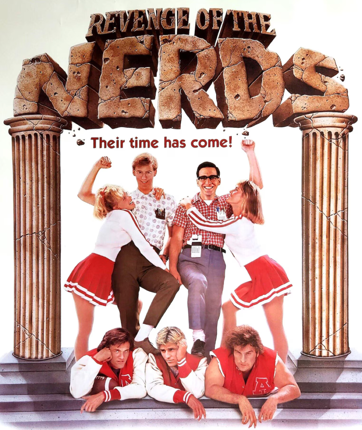 A diferencia de las películas anteriores, Revenge of the Nerd muestra de manera plena el estereotipo del nerd, consolidando una imagen que venía construyéndose desde los cincuenta y sesenta, y había empezado a adquirir un uso mucho más extendido en la cultura americana de los setenta. En esa película, Lewis Skolnick (interpretado por el recientemente fallecido Robert Carradine, sí, el hermano del protagonista de Kung Fu) y Gilbert Lowe (Anthony Edwards, quien luego encontraría un rumbo médico en el drama E.R.) ingresan al Adams College con claros intereses de dedicarse al estudio de la programación y la robótica. Los miembros de la fraternidad Alpha Beta, comandados por Stan Gable y cuyo "campeón" no era otro que Frederick Aloysius "Ogre" Palowaski, representaban un colectivo más amigo del fútbol americano que de la mínima empatía.