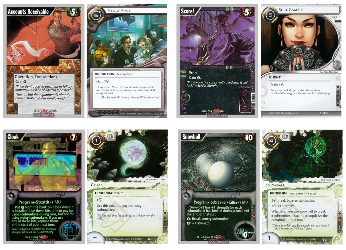 Nótese dos elementos disruptivos. Primero, Netrunner es un juego asimétrico, es decir, que ambos jugadores juegan con reglas y objetivos distintos. Este rasgo no es tan infrecuente en los juegos de mesa modernos, pero sí en los dueling card games, donde el axioma cero es que los jugadores compiten en igualdad de condiciones. La idea de que cada lado se juegue distinto suena, entonces, por lo menos rara. Pero en Netrunner tiene todo el sentido del mundo. La corporación juega a la defensiva, con dos grandes armas a su favor: la plata, que le sobra, y el secreto, ya que todas sus cartas entran en juego boca abajo.