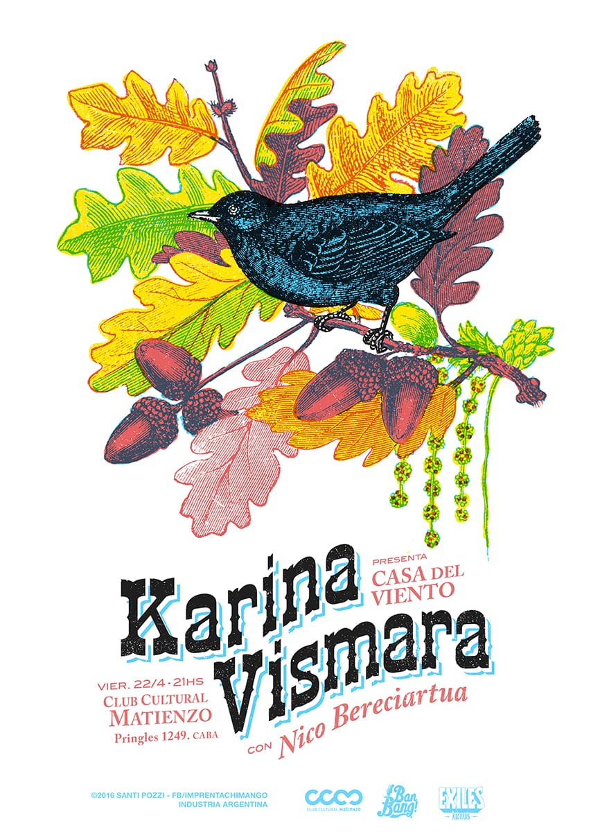 Unos meses después de esta juntada, Karina dejó Balcarce otra vez para instalarse en Capital. Y más adelante presentó Casa del viento en un Centro Cultural Matienzo que estrenaba ubicación en el barrio de Almagro. Nico Bereciartua abrió esa fecha, para la que Santi Pozzi hizo un póster precioso, que me viene bien ahora como ayuda memoria.