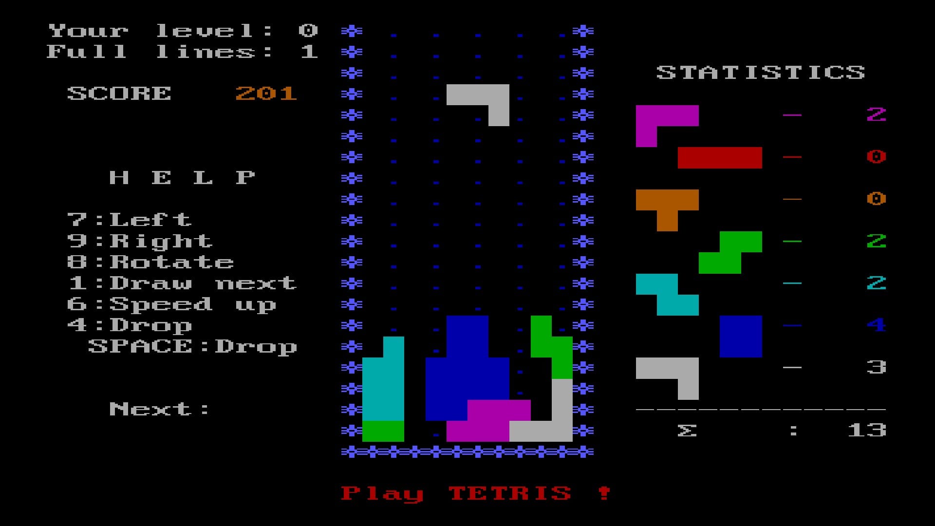 En segundo lugar, el Tetris original nunca salió del laboratorio de la Academia de Ciencias de la URSS. La versión que se difundió a través del mundo comunista fue la de DOS, programada por Vadim Gerasimov, compañero de Pajitnov. Esa ya tiene colores, por ejemplo, algo ausente del prototipo original, y la podés jugar online acá. En PC no había por qué limitarse a la abstracción pura, así que podemos pensar que fue una búsqueda deliberada.