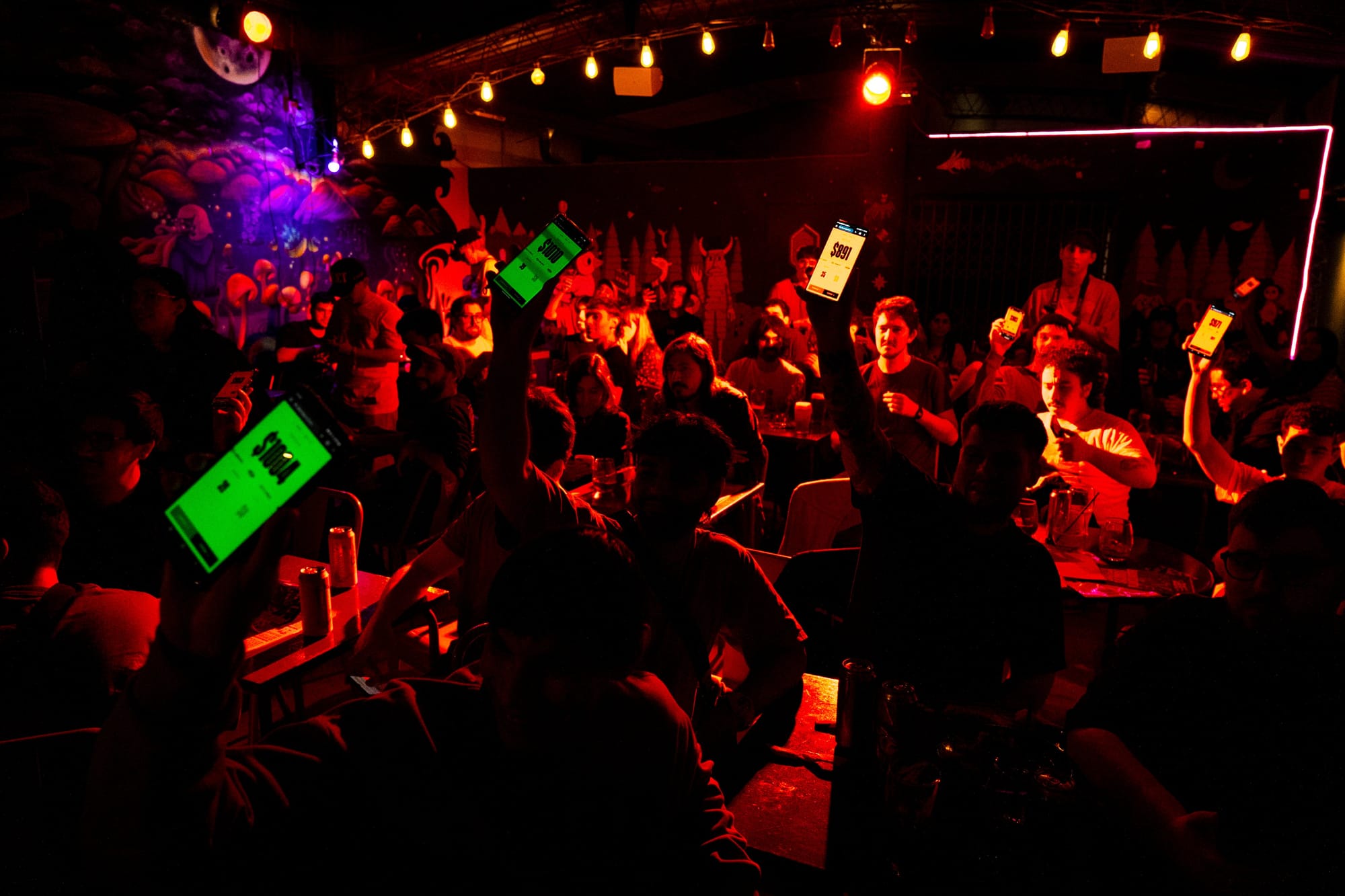 Una vez adentro del evento, los requerimientos de login son débiles adrede. Sabemos que también alguno querrá smurfear. El anonimato (tu identificador es un emoji) y el feedback sensorial inmediato a tus acciones en la pantalla y en las caras del resto amplifican comportamientos que nos mantienen, para bien o para mal, vivos. A lo largo del cachengue, diferentes "mutators" cambian el estado del mercado empujando la tendencia hacia diferentes direcciones y forzando a los participantes a tomar decisiones rápidas, a medida que entra información nueva. Y a veces falsa.