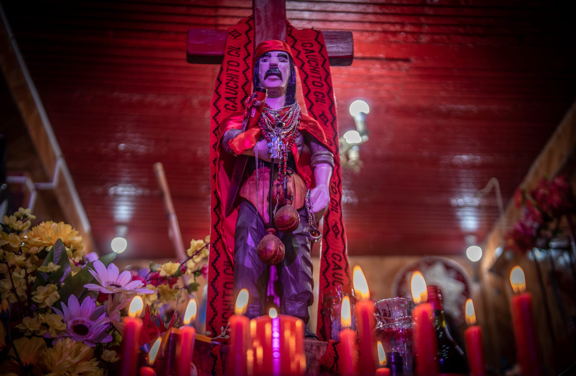Su relación con el catolicismo se inscribe en esta misma lógica de fricción. La institución no lo reconoce, pero existe. Lleva la cruz y se le reza como intermediario ante Dios. A pesar de ser definido como un santo pagano, los curas de las zonas aledañas al santuario le abren las puertas a los devotos y milagreros, bendicen las imágenes, besan las estatuillas y dan misa en su nombre.