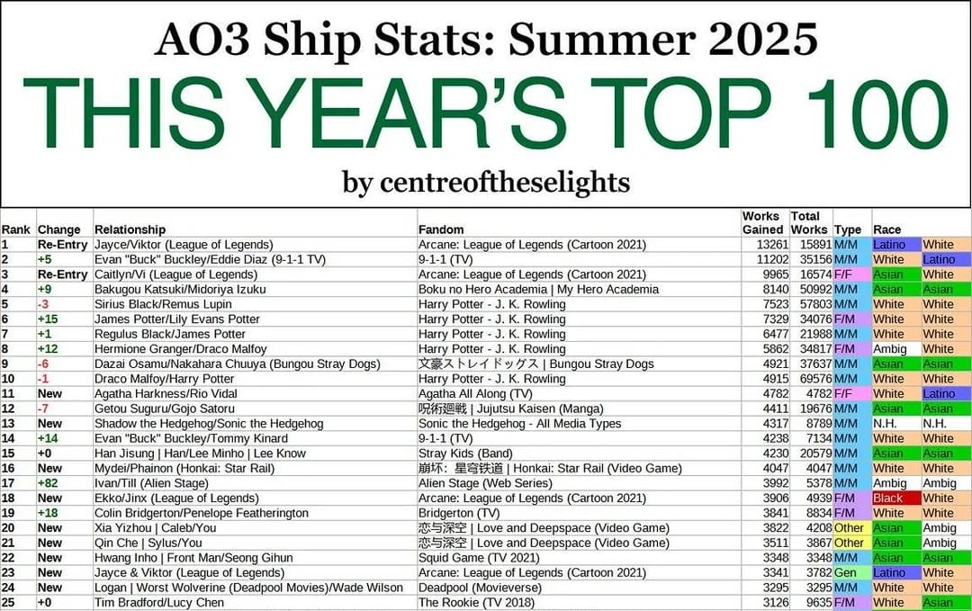 Ya que estamos con los charts, por mera curiosidad analítica y como ya estamos en noviembre, los ships más trabajados del mundo del anime/manga en 2025 fueron los siguientes: